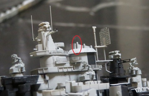 1/700 Tennesseeこの赤枠で囲んだ部分をご注目。なんか大雑把な造りになっていますが、箱絵を見るとこのようにキノコ型になっているようです。そこで···