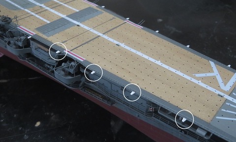お鶴さん舷側表示灯を作ります。0.5mmプラ板を小さく切り出して飛行甲板のフチに取り付けます。(白丸部分)軍艦色で塗装後、透明ランナーを火で伸···